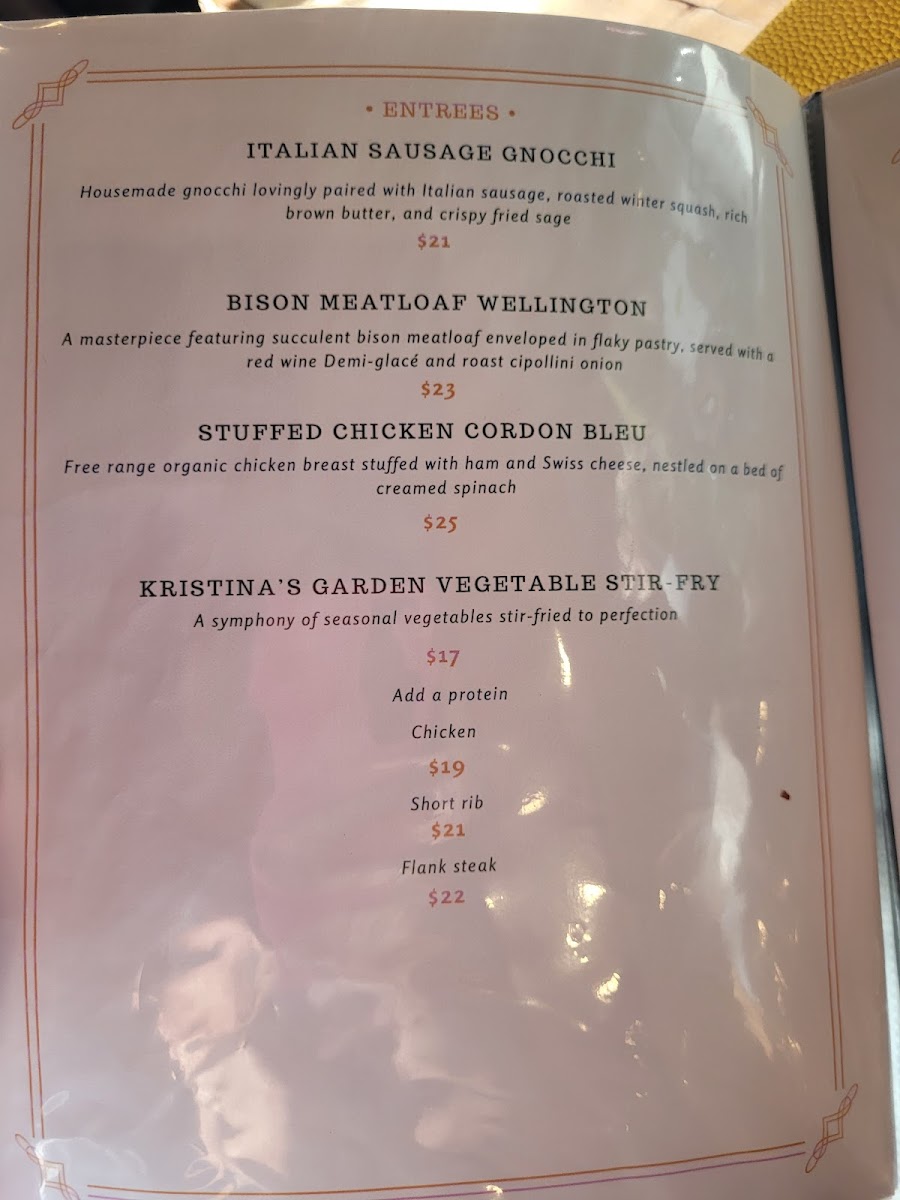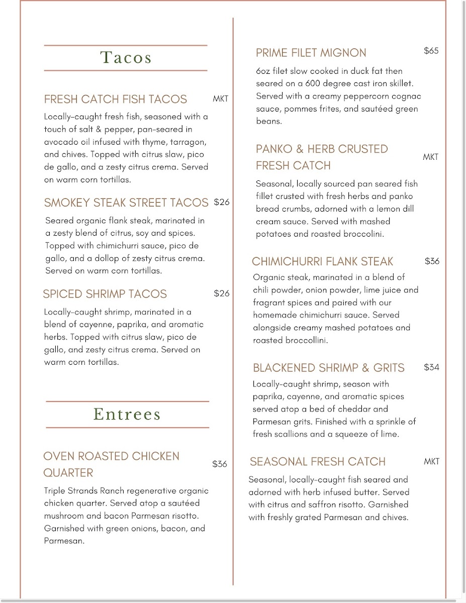 For entrees, indulge in the Oven Roasted Chicken Quarter or the day's Seasonal Fresh Catch, which capture the essence of farm-to-table freshness. Don't miss out on the Seasonal Creme Brulee—a perfect ending to your meal.
