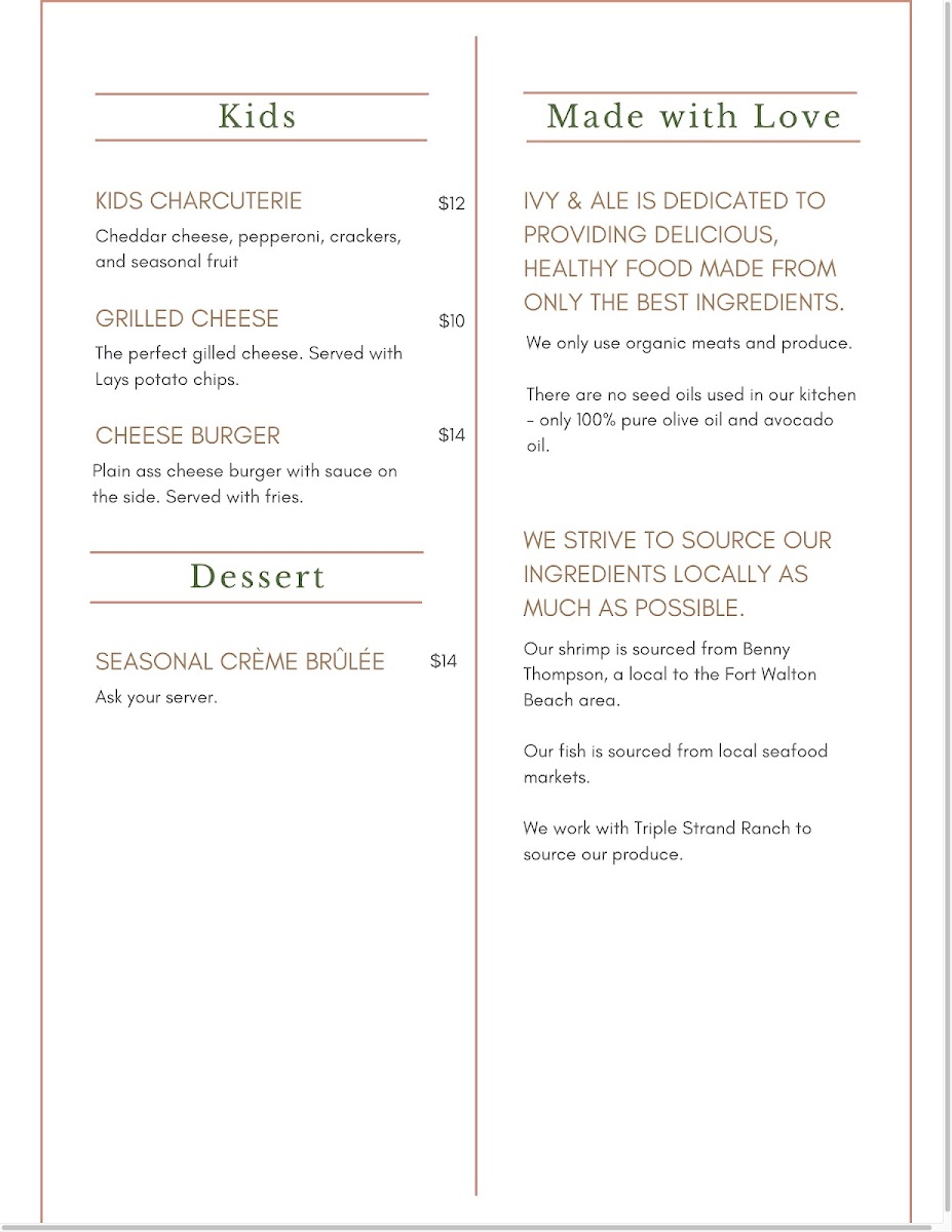 Welcome to Ivy and Ale, a charming boutique restaurant nestled in Fort Walton Beach, FL. With its enchanting ambiance and a delightful menu, Ivy and Ale promises an unforgettable dining experience. Start your culinary journey with an Artisanal Charcuterie Board or the Whipped Feta, showcasing the chef's dedication to presentation and flavor.